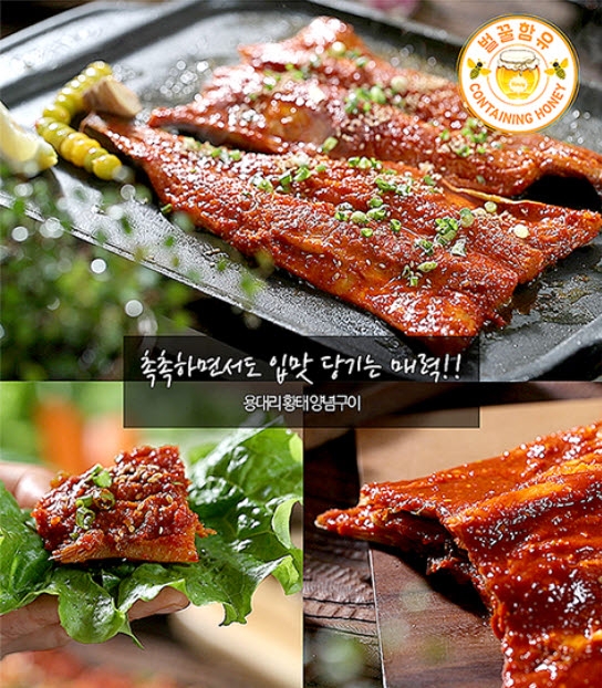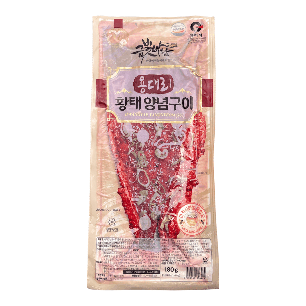 Cá minh thái khô 60%, xốt cá minh thải khô nướng 40% [xốt ớt đỏ 36,01% (syrup ngô, nước xốt ớt, gạo lứt, muối, bột ớt đỏ), syrup ngô 23,15%, nước có ga 7,72% {fructose lỏng, đường, chất bảo quản (carbon dioxit), Chất điều chỉnh độ acid (acid citric), hương chanh nhân tạo), đường, nước tương, củ cải, mật ong 7,72%, hành tây, nước xốt 2,32%, tỏi, lê, bột ớt đỏ, táo, bột gừng, Chất điều vị (Monosodium L-glutamate), dầu mè, tiêu trắng, dầu hương ớt đỏ nhân tạo, dashi thịt bò 0,08%, hondashi 0,07%]