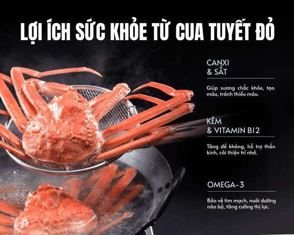 Đặc biệt, cua tuyết đỏ rất giàu Omega-3, giúp cải thiện sức khỏe tim mạch và não bộ. Nhờ nguồn dinh dưỡng dồi dào, loại hải sản nhập khẩu này phù hợp với nhiều đối tượng: từ trẻ em, người lớn tuổi cho đến dân văn phòng bận rộn. Đây chính là lý do cua tuyết đỏ ngày càng được nhiều gia đình Việt Nam lựa chọn trong thực đơn hằng ngày.